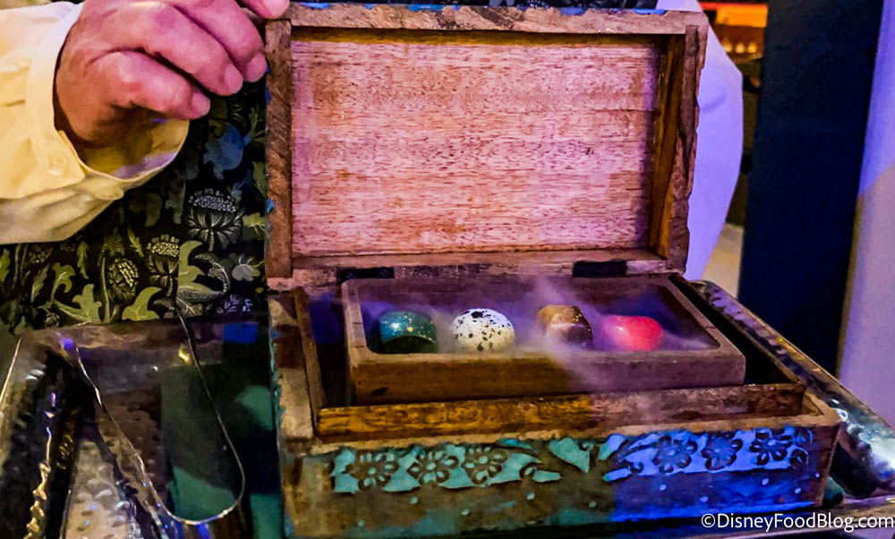 Dessert includes four different sweet treats. The table will get to try Miner’s Treasures (cookies ‘n’ cream panna cotta topped with chocolate gems and an edible chocolate Dopey hat), “Poison” Apple (dark chocolate-apple mousse with a sour apple center), a Fairy Tale Gooseberry Tart (meringue and gooseberry inside a tart shell), and The Hunter’s Gift to the Queen (four small treats that are presented to you in a smoke-filled wooden box).