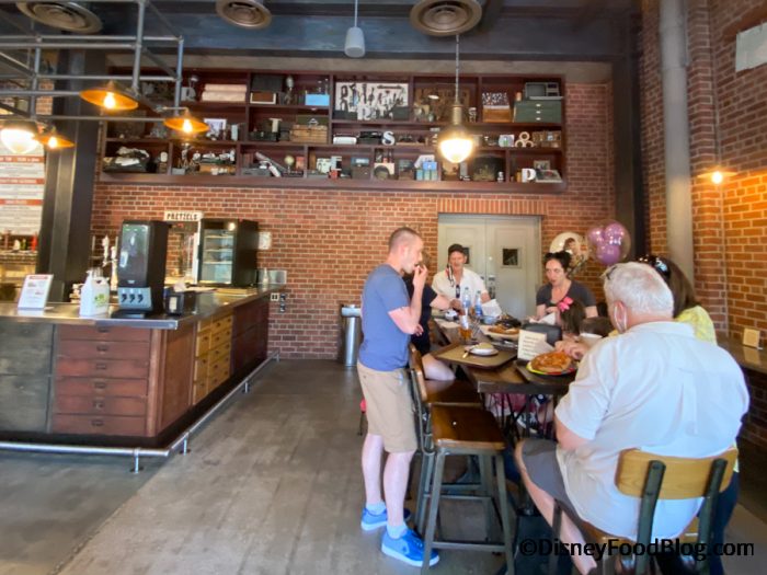The vibe here is relaxed and easy-going. The walls are brick and covered in callbacks to Disney history and an homage to what was previously in this spot. This wall has letters placed around it that spell out “Writer’s Stop” — our beloved spot for coffee and pastries, which was the original home of the Carrot Cake Cookie.