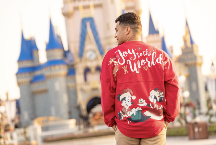 First up, check out this “Joy to the World” holiday spirit jersey. It features Minnie and Mickey exchanging holiday gifts.