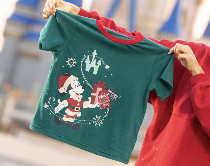 Next, check out this youth holiday shirt! We love that it has a red collar so that it’s easier to match with the adult spirit jerseys. On the shirt, Mickey is holding a gift with the tag that reads, “Mickey’s Very Merry Christmas Party.”
