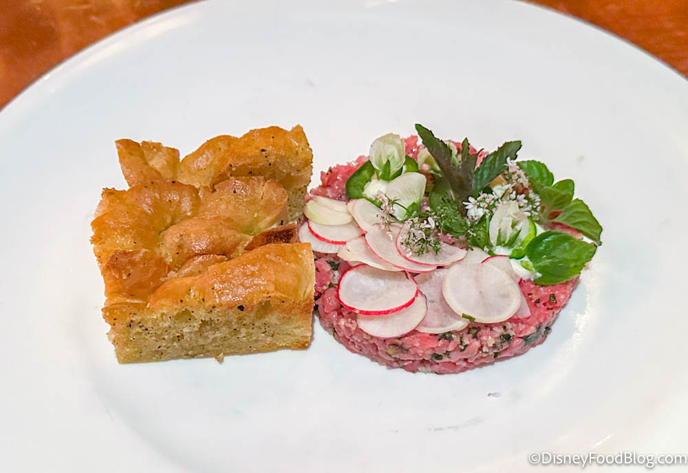 You’ll find the signature Monsieur Paul Restaurant — a fitting tribute to Chef Paul Bocuse — in EPCOT’s France pavilion located upstairs from Les Chefs de France. Each meal starts with a glass of champagne (for of-age guests) and then progresses through five courses with The Gastronomic Meal of The French. The view is beautiful, the food is delectable, and the service is excellent at this Signature dining restaurant.
