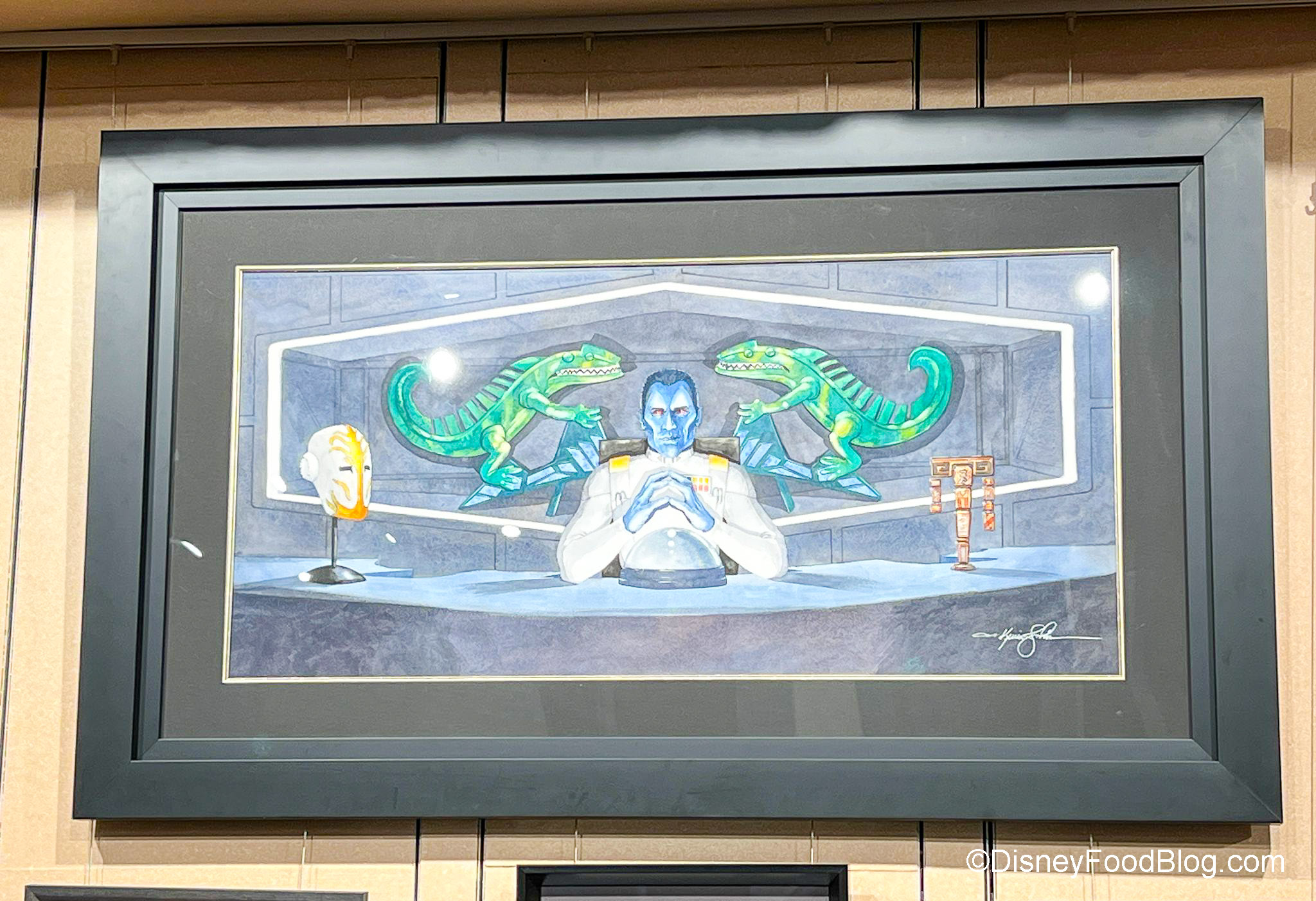 OK, so first, we’re going to give you a little background information about the latest souvenir we discovered, so buckle up. It’s an original art piece by Kevin-John Jobczynski, meaning it’s the only one like it in the world. The artwork depicts Grand Admiral Thrawn, a character who might only be known by expert Star Wars fans.