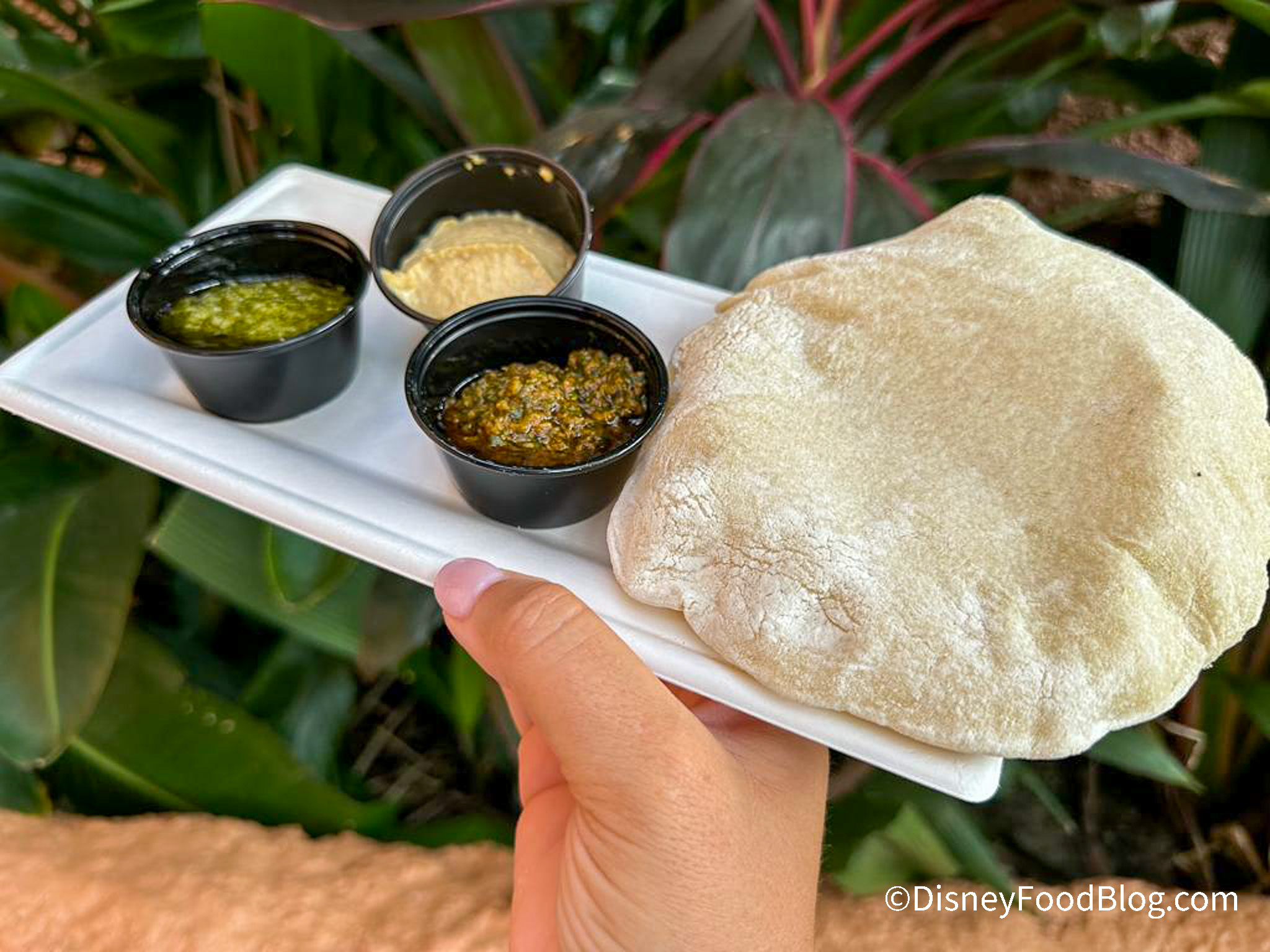 Next, we tried the Stone-baked Moroccan Bread with Hummus, Chermoula, and Zhoug Dips for $5. Y’all, this bread is so light and fluffy — it doesn’t even NEED any dips. But, we tried them anyway, of course!