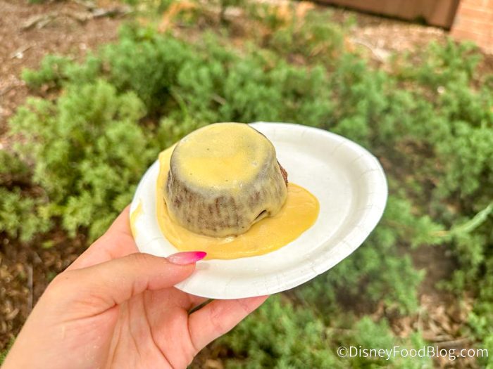 Next, we got the Canadian Filet Mignon served with mushrooms, Boursin Black Truffle & Sea Salt mashed potatoes and a Boursin Black Truffle & Sea Salt whipped butter. This is one of the pricier festival eats, at $9.75. This year, they added mashed potatoes on the side of this dish, and we LOVED it.