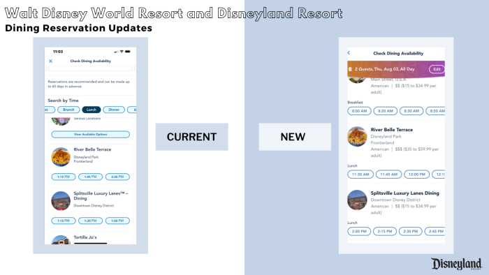 And, as we mentioned above, this won’t just be done in Disney World. The change will also be rolled out in Disneyland. The image below displays the current view on the left and the updated view on the right. Again, you can see just how many more reservation times will be showcased (provided reservations are available).