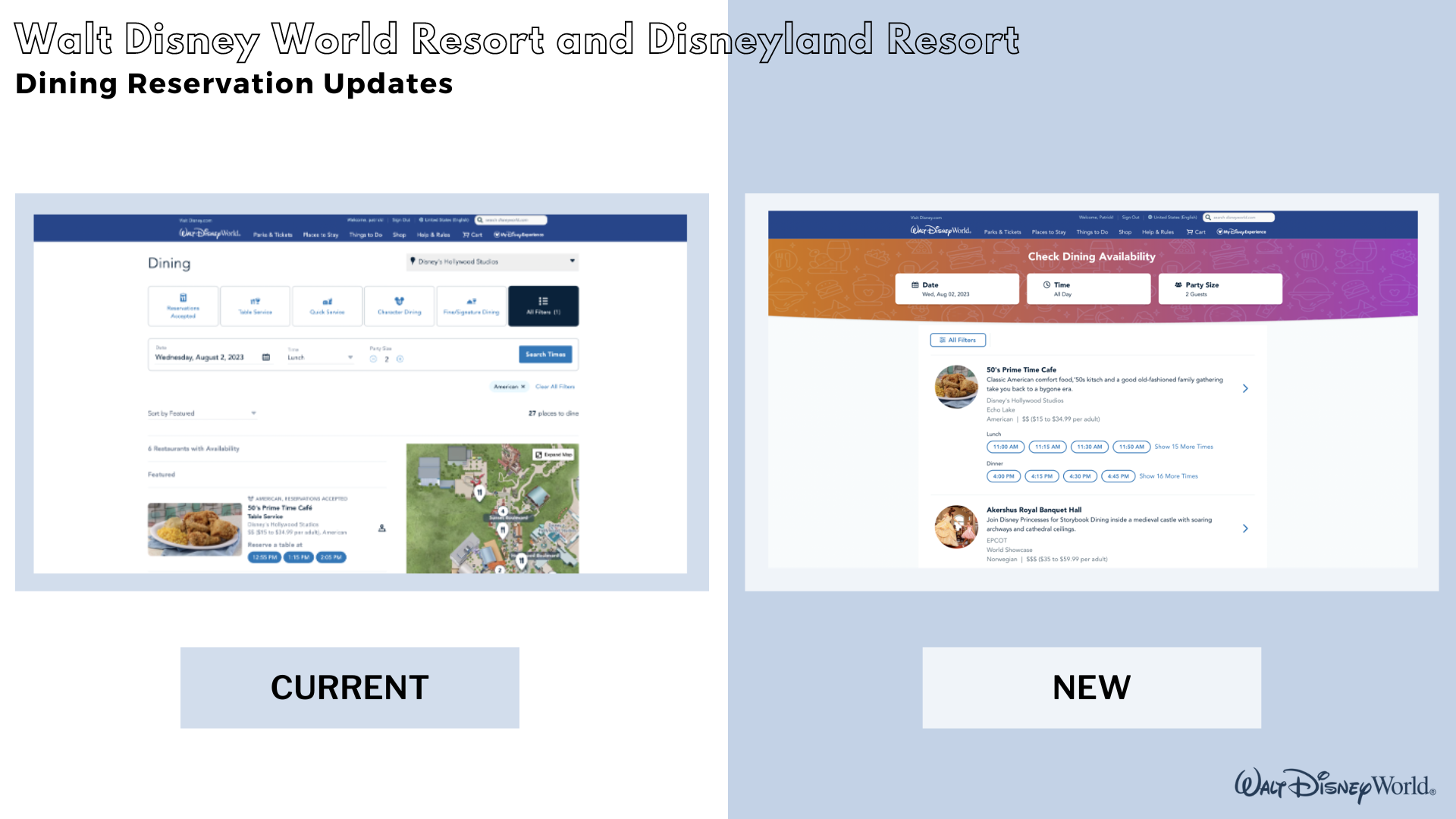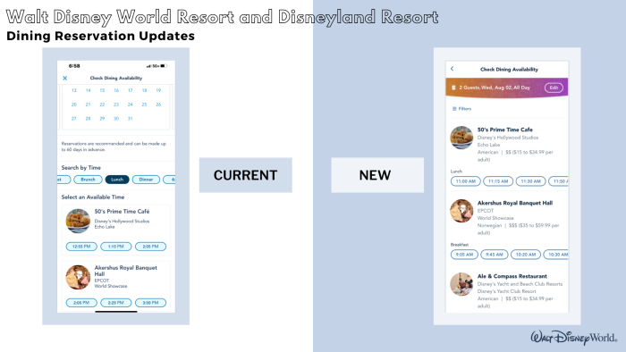 To give you a better idea of what we mean, let’s take a look at some graphics. In the image below, you’ll see the current reservation view for Walt Disney World dining reservations on the left and the updated view on the right.