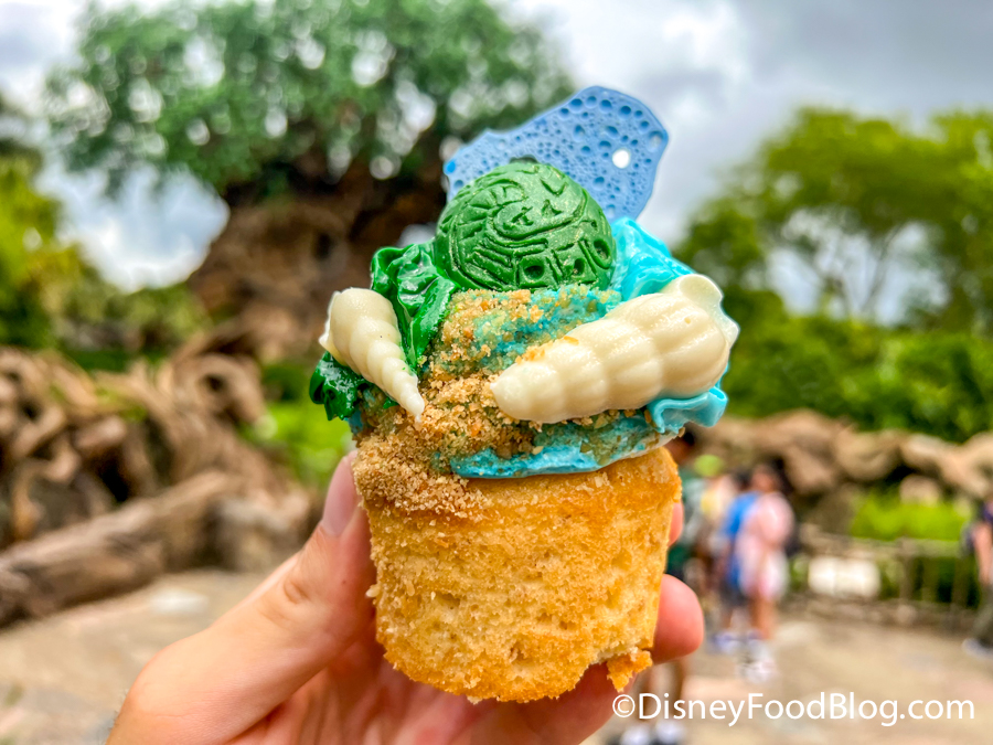 We’ve tried color-changing mousse, a DOLE Whip Cone that looks like Rapunzel’s long locks, and a mermaid milk shake that looks like it’s covered in … seaweed? Cute seaweed, that is! Now, we’re headed over to Disney’s Animal Kingdom to check out a new cupcake dedicated to our favorite wayfinding princess.