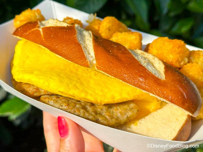 So let’s head into Fantasyland and visit Friar’s Nook. Previously, you could get a Breakfast Sandwich there, which featured Bacon, Egg, and Cheddar served on a Multigrain Croissant with Tots. Well, that Breakfast Sandwich is now Sausage, Egg, and Cheddar served on a Pretzel Bun with Tots for $9.25.