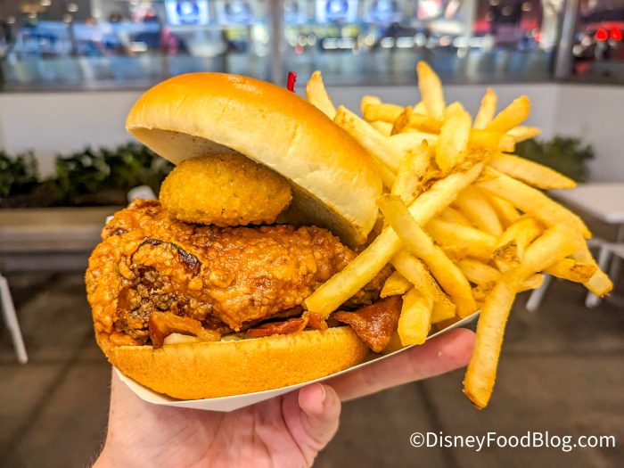 Next, we’re trying some snacks from Cosmic Ray’s Starlight Cafe. First is the Terrifyin’ Twice Spiced Chicken Sandwich, which is spicy fried chicken breast dipped in hot honey topped with pepper jack cheese, jalapeño poppers, and bacon.