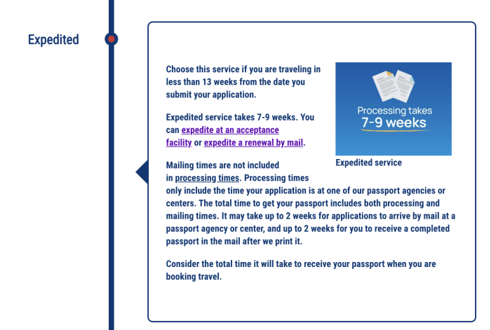 For example, Expedited Service is available if you are traveling less than 13 weeks from the date of your application’s submission.