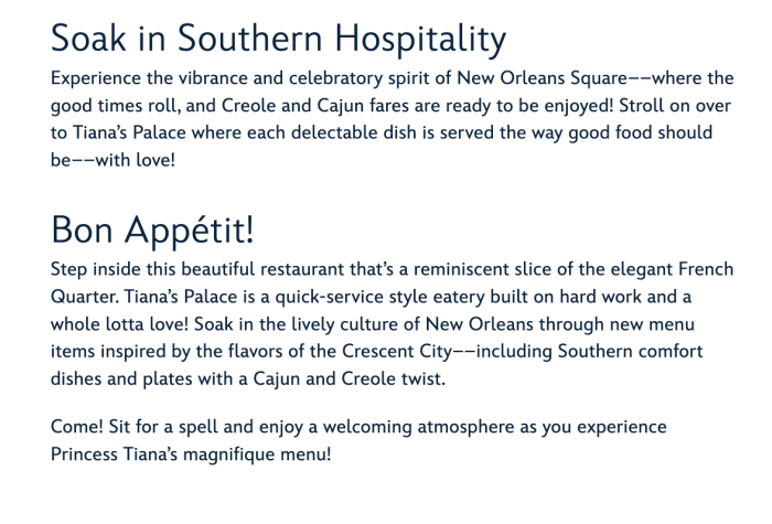 The website also notes that there may be Disney Vacation Club member discounts and Disney Visa Cardmember discounts available here too. The Disney Visa page notes that there used to be a discount available at the French Market Restaurant, so we’ll have to see if it’ll apply here too. Neither the French Market Restaurant nor Tiana’s Palace are listed on the DVC page but we’ll look for updates.