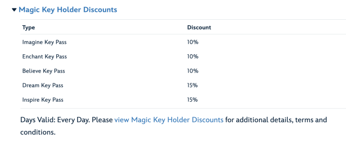 In terms of discounts, there will be Magic Key Holder discounts available here, which you can see below.