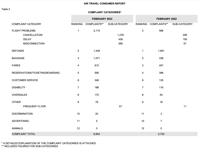 One of the most interesting stats displayed was the number of customer complaints that U.S. airlines received as a whole. In February 2022, the total number of complaints was 1,889. In February 2023, however, the total was much higher: 4,405. That means that that the number of customer complaints more than DOUBLED over the last year.