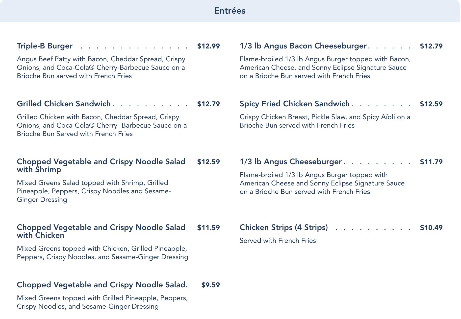 There are several entree options at Cosmic Ray’s, including various burgers, salads, chicken sandwiches, and chicken strips.