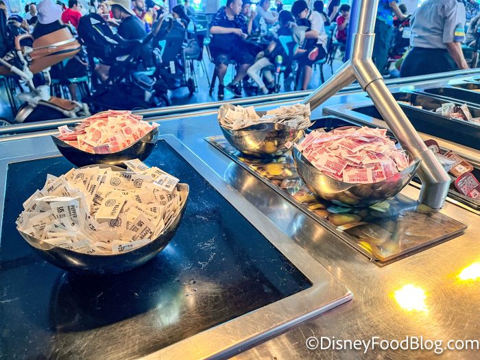 There are multiple utensil stations throughout the restaurant, and you’ll find napkin dispensers alongside them.