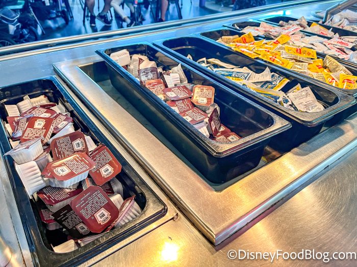 Sadly, this toppings bar is not what it once was. You can no longer pick up things like cheese, lettuce, and tomatoes here. Instead, you’ll be able to get prepackaged condiments on this buffet line.