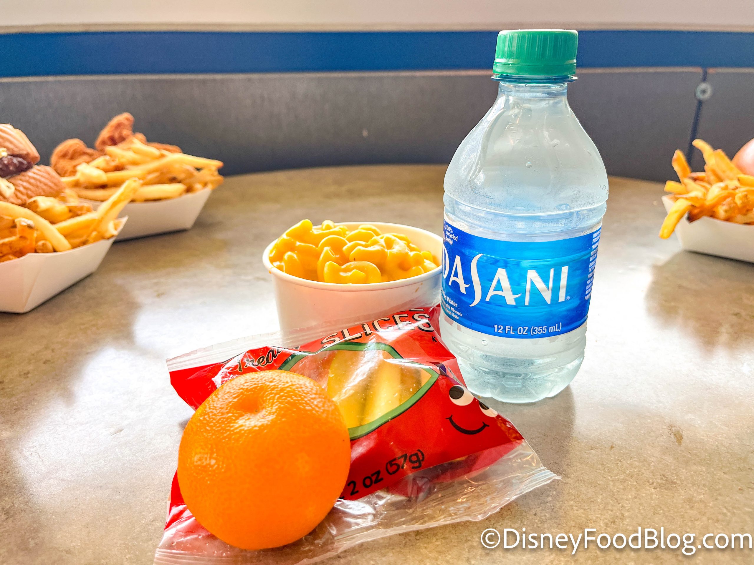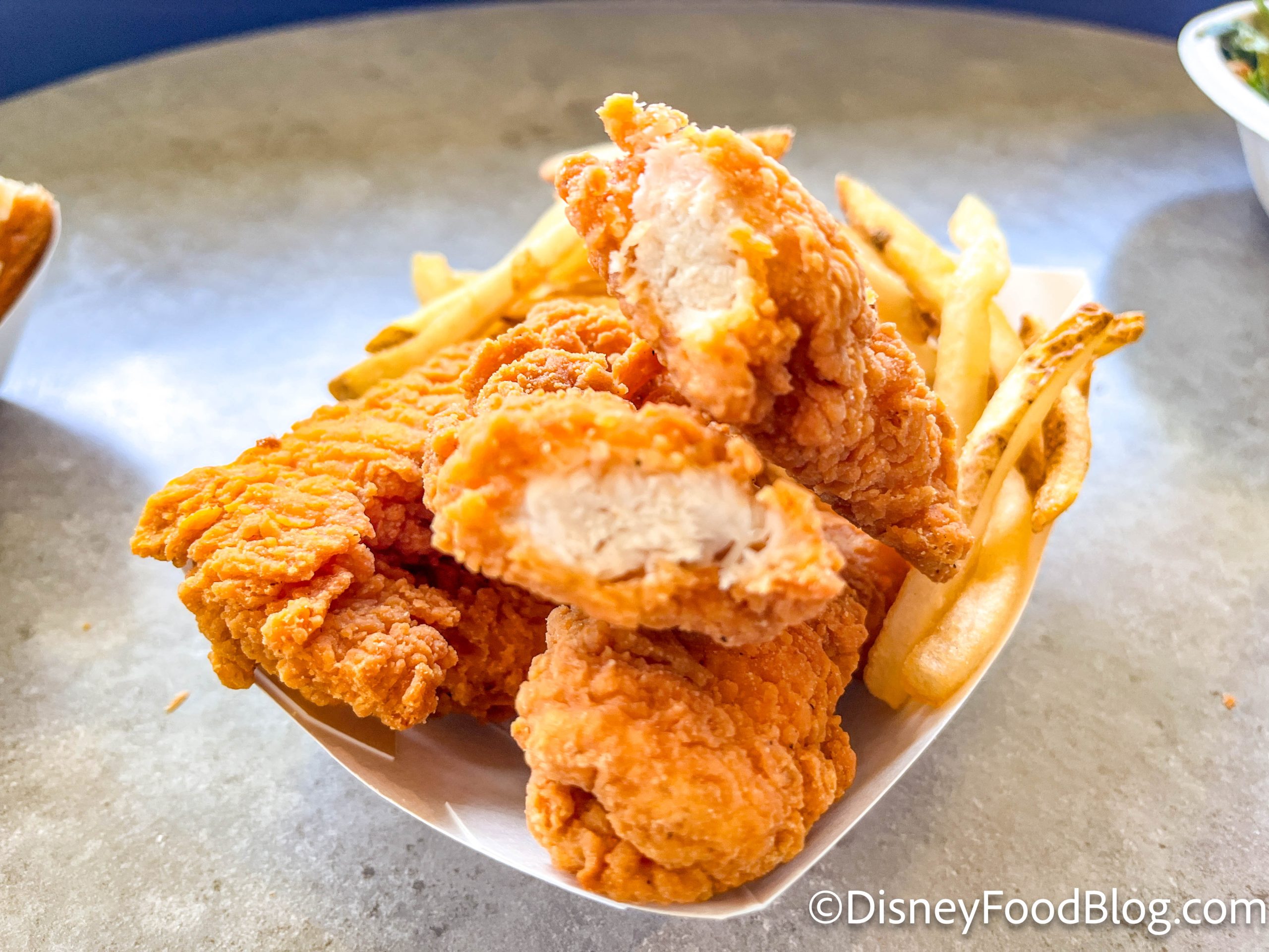 I visited with a coworker, so we got six different menu items to try, with a focus on items we haven’t reviewed here on the blog before. First up, we’ve got a classic Disney World entree — the Chicken Strips meal for $10.49. It comes with french fries on the side!