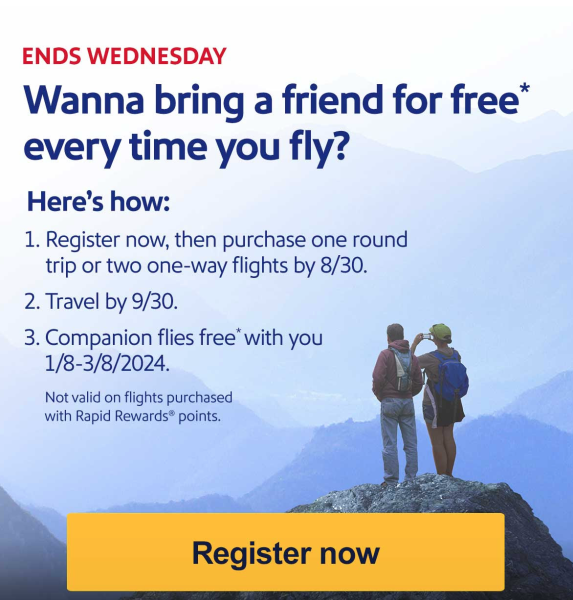 Now, there are some important terms to keep in mind. First, you do need to register for the promotion and purchase 1 round-trip or two 1-way flights by 8/30 — that’s just 2 days away! (You need to book by 11:59 p.m. CDT on August 30th, 2023 so act fast.) Second, you must travel with Southwest before September 30th. THEN you’ll be able to have a companion fly with you for FREE (not including taxes and fees) between January 8th and March 8th, 2024.