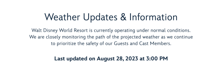 As of 3PM on August 28th, Disney had the following listed on the Disney World weather updates website regarding Tropical Storm Idalia, “Walt Disney World Resort is currently operating under normal conditions. We are closely monitoring the path of the projected weather as we continue to prioritize the safety of our Guests and Cast Members.” (Note that Disney updated its website on August 29th and the statement remains the same.)
