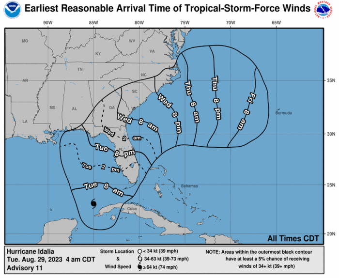 The tropical storm warning notes that Hurricane Idalia is expected to “cross the Florida Gulf coast on Wednesday as a major hurricane” and that preparations should be done this morning ahead of local tropical storm conditions that are expected by tonight into Wednesday.