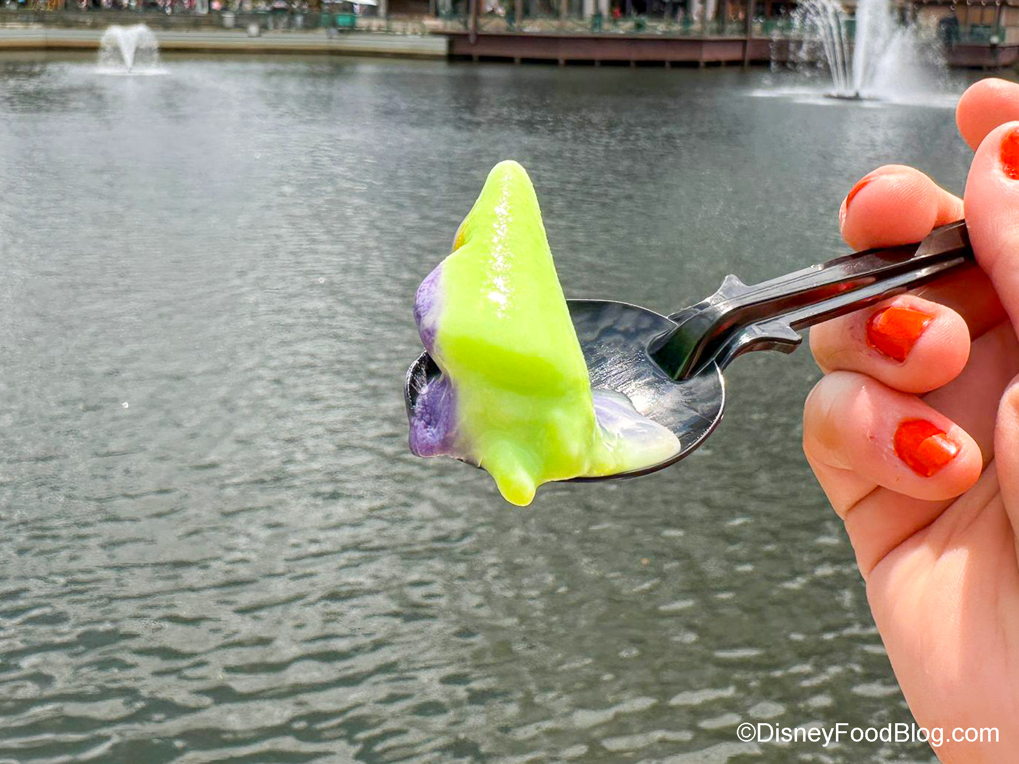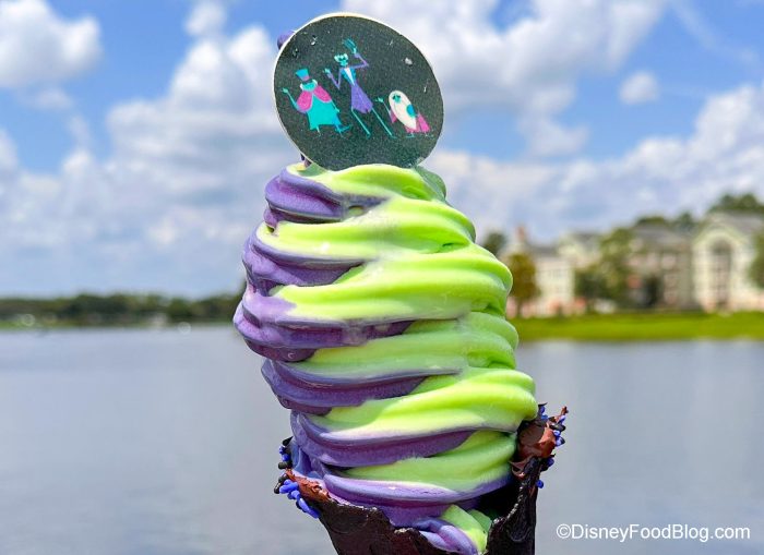 Let’s start with the new Haunted Mansion Cone. It’s a pistachio and purple cheesecake soft-serve swirled in a black vanilla cone with a Hitchhiking Ghosts chocolate medallion. You can try it for $6.49.