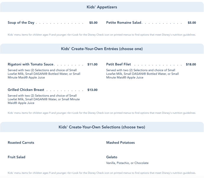 You’ll find a character breakfast and signature dinner here, with some fresh breakfast options served through 12:15PM. Then, the restaurant closes for the afternoon and reopens for dinner from 5PM to 9:30PM. Here’s a look at the dinner menu, starting with the appetizers.
