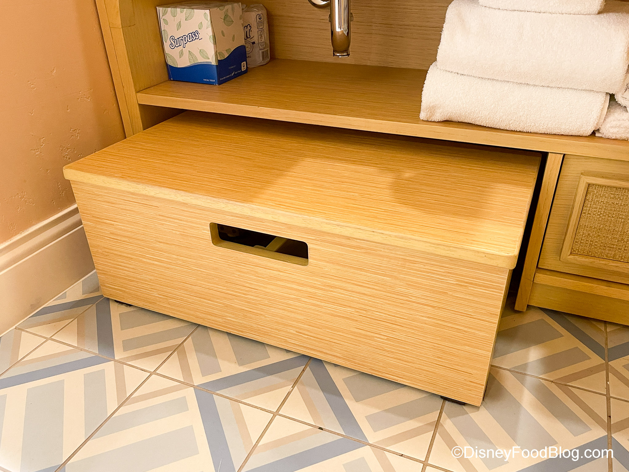 To the right of the sinks are some shelves — these rooms have a lot of great spaces for organization and storage.