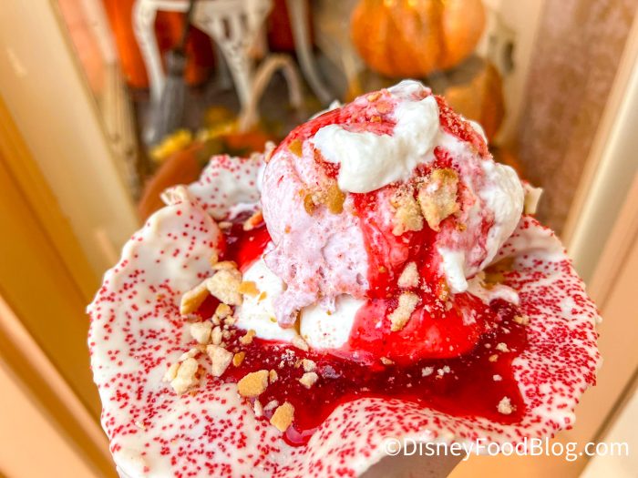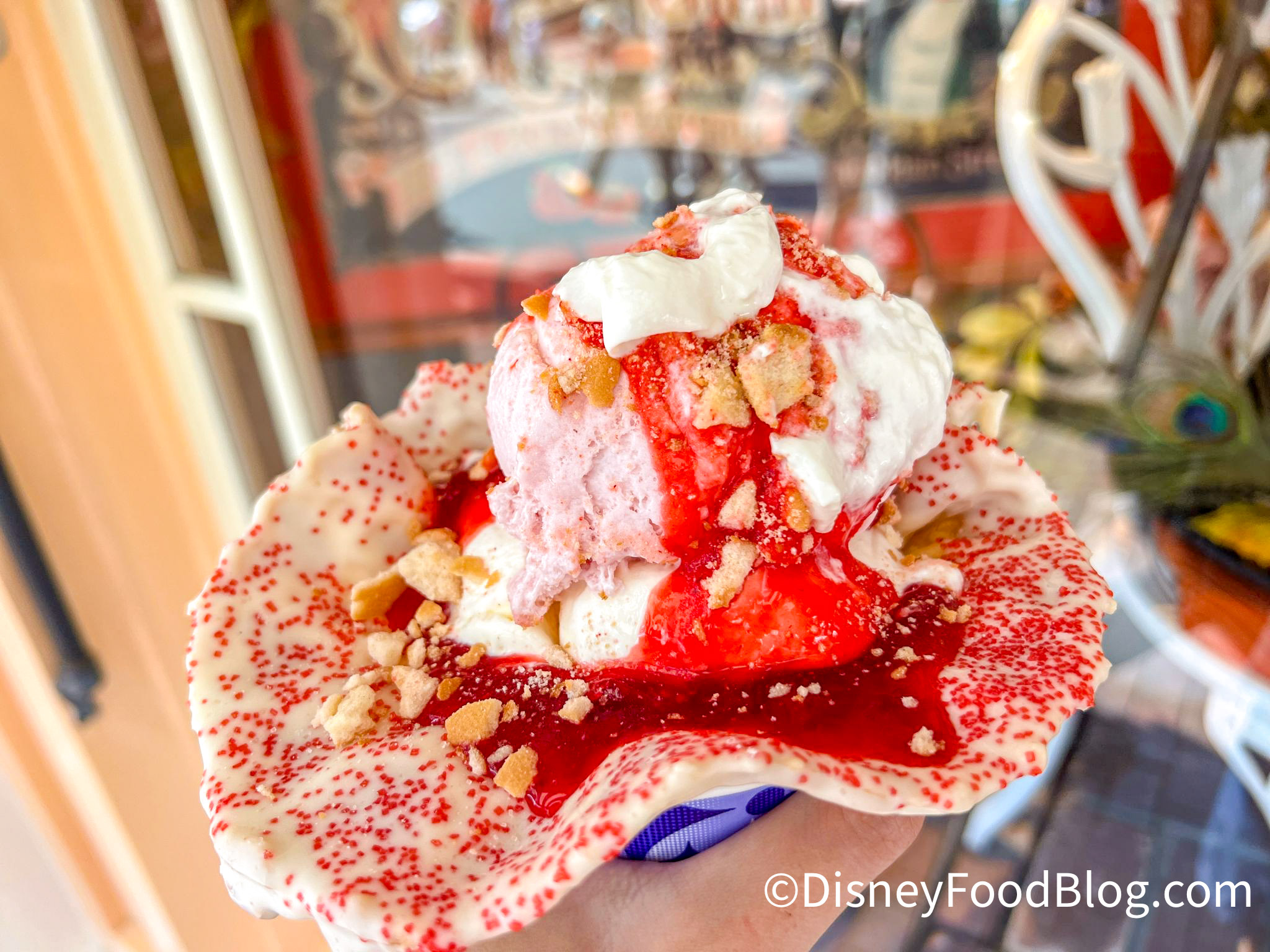 We’re DisneyFoodBlog, so we try alllll the new offerings and tell you all about them to help you decide what is and isn’t worth the money. We headed over to Gibson Girl Ice Cream Parlor to try their new sundae. Spoiler alert: it was an explosion of strawberries!