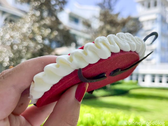 Our next stop took us to Beach Club Marketplace at Disney’s Beach Club Resort to pick up the Captain Hook Cookie for $6.29. It’s made of Vanilla Sable with Strawberry Jam, Peanut Butter Ganache Buttercream, and Chocolate Décor.