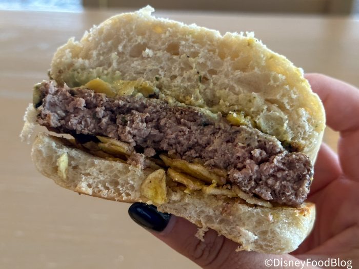The burger is fine but didn’t scream “Caribbean” to me beyond the pineapple salsa and the spice. The tomatillo-jalapeno cream cheese tasted more like an avocado spread. The crunchy layer underneath the burger patty is freeze-dried plantain chips and gives an audible crunch as you initially bite in but tapers to a subtle crunch where only you hear it the loudest as you continue to eat.