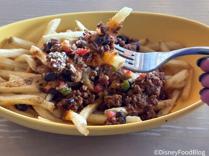 The fries are standard “Disney” fries you can get practically anywhere fries are served but the toppings were nice. They’re a bit heavy so I had to scoop them with a fork however, the chili was delicious and meaty with black beans. The cotija cheese had a distinct sharper taste (kind of like queso fresco or goat cheese) to it but didn’t leave the top of my mouth coated which I appreciated. The salsa was fresh but tasted more like pico de gallo.