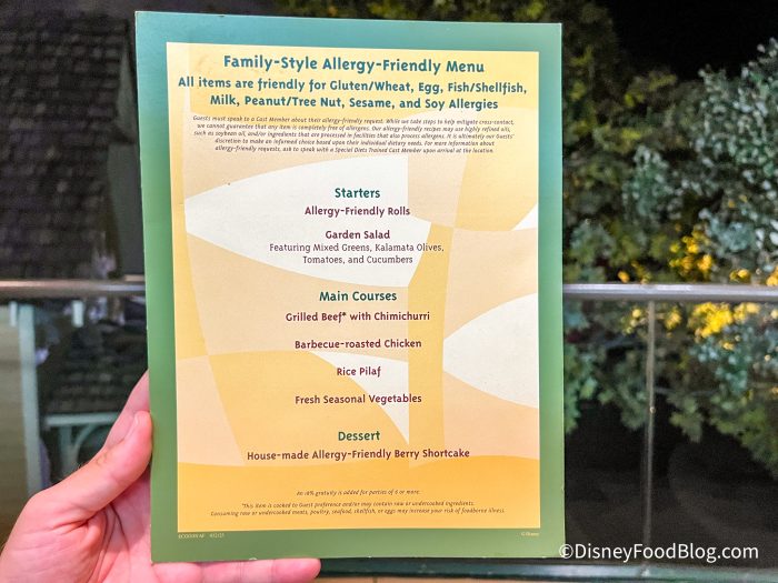 The premise of this restaurant is that you’re there for Chip ‘n Dale’s Harvest Feast which is a family-style meal so you get all the options with plenty to share! They have a regular menu and a plant-based menu (which is appropriate for a location named Garden Grill).