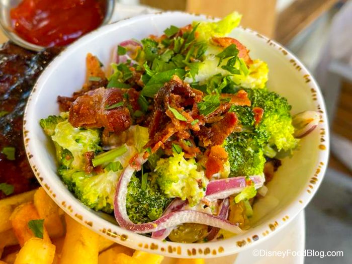 We didn’t mind having to eat it with a fork, though, because it was good. The spicy is more of a “Disney spicy” (so not too much heat at all), but the acidity from the crispy slaw and the sweetness of the pickles cut that down. We would say that this sandwich is sharable if you’re not super hungry.