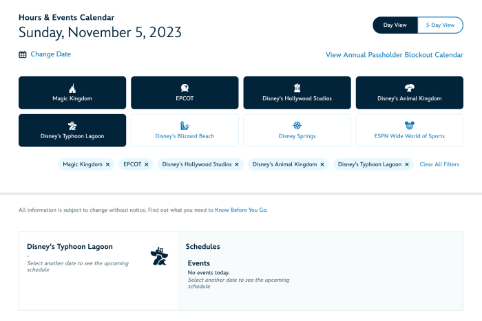 Since the closures of 2020, we haven’t seen both water parks open at the same time, so when Blizzard Beach reopens, that could mean that Typhoon Lagoon will close for its seasonal refurbishment. Currently, there are no hours listed for Typhoon Lagoon starting on November 5th! That could be the date that it closes for refurbishment and Blizzard Beach opens.
