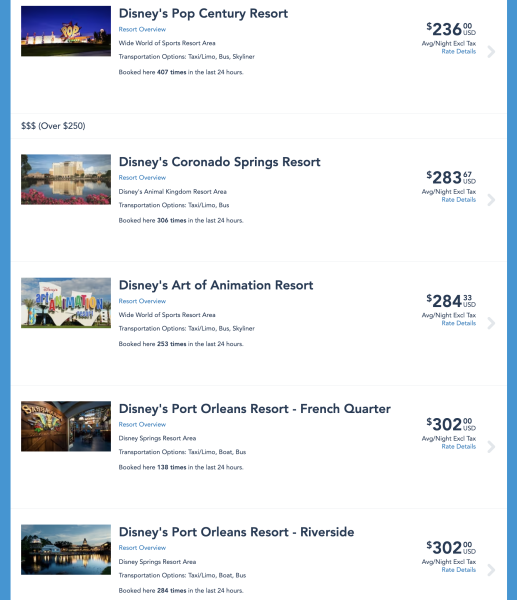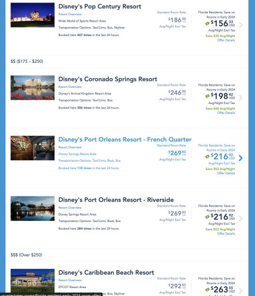 This time, the Art of Animation was the LEAST expensive option. The Port Orleans resorts were the MOST expensive options ranging from about $100-150 more expensive than the other options. There’s currently no Florida resident discount available for these dates.