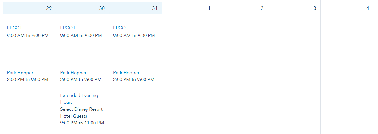 EPCOT is open from 9AM to 9PM throughout the rest of October. Extended Evening Hours are on October 30th from 9PM to 11PM.