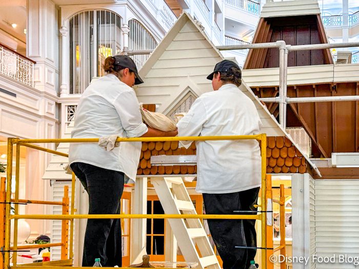 A few days ago, Cast Members started assembling the gingerbread house, attaching cookie shingles with giant piping bags of icing.