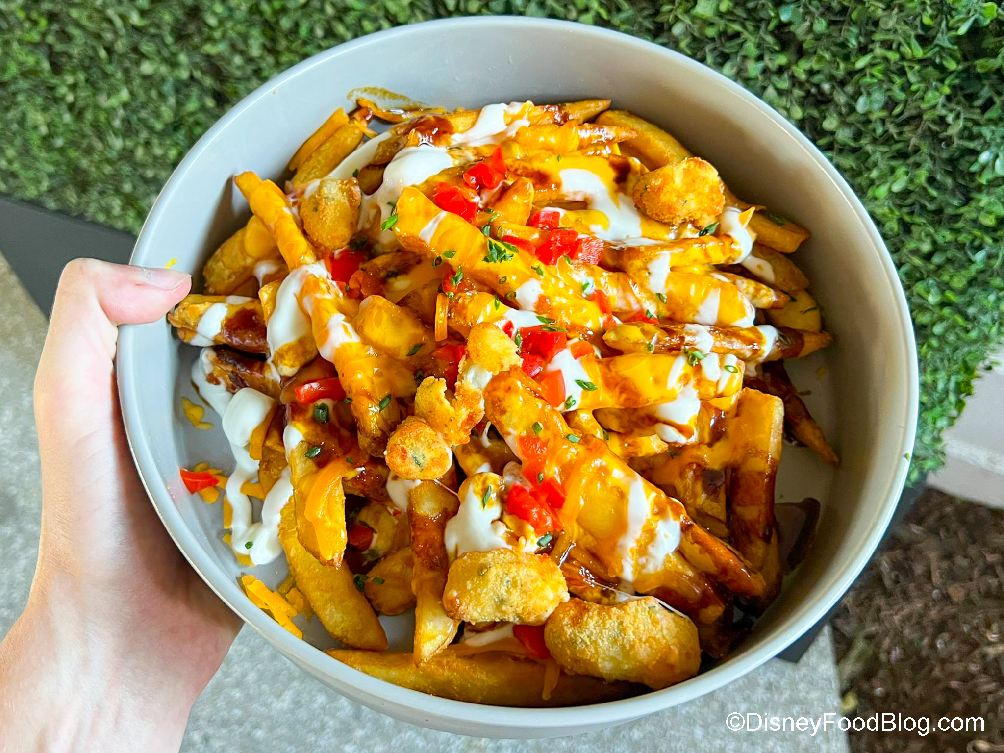 Okay, so let’s talk about the food here. The Cheese Fry Poutine for $19 is made with Demi-Glace, Cheese Sauce, Chive Sour Cream, and Pimento. Okay, this was INCREDIBLE. It’s got the fried cheese curd plus all that extra cheese. It’s a cheesy take on poutine with a LOT of cheese, and well, you know that’s our weakness, right?