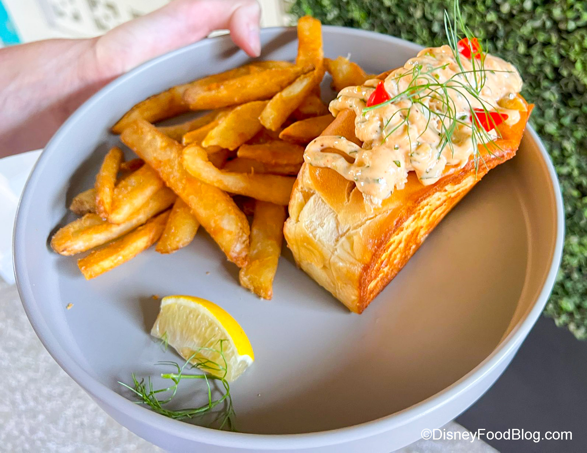 Then it was time for some entrees. The Jumbo Lump Crab Roll for $29 is made with Tarragon and Lemon Aïoli, Fresh Dill, and Brioche and served with French Fries, House Potato Chips, or Fresh Fruit. We opted for fries…for reasons. So our reporter isn’t really into seafood, but liked this roll, especially the bread.
