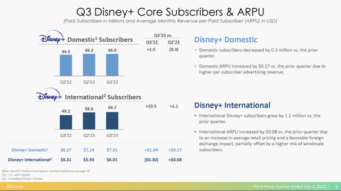During the Q3 2023 earnings call, Iger said Disney’s streaming business is still young when justifying the platform’s struggles but we’re starting to inch into adulthood when it comes to Disney+. Disney reported that “Direct-to-Consumer revenues for the (third) quarter increased 9% to $5.5 billion.” Despite subscriber loss, Disney still cashed in on monthly revenue, with monthly increase “from $7.14 to $7.31 due to higher per-subscriber advertising revenue.”