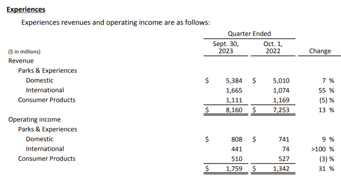 Disney Parks, Experiences, and Products revenues for the quarter increased overall by 13% from $7.253 billion in the same quarter last year to $8.16 billion this quarter. The segment operating income (the difference between segment net revenue and the sum of operating expenses and segment revenue) decreased 31% from $1.342 billion in 2022 to $1.759 billion this quarter.
