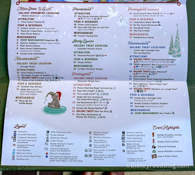 Inside, you will find the locations for all of the holiday-themed snacks you can get at the party. Not all restaurants will be open during the party, and the ones that ARE open might not be open the whole time. Look closely beside each restaurant listed on the map to make sure your planned visit is within operating hours.