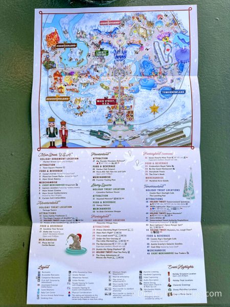 There’s also an easy-to-navigate Christmas-themed map of Magic Kingdom right above the guide so that you can easily see where you are based on landmarks and park icons.