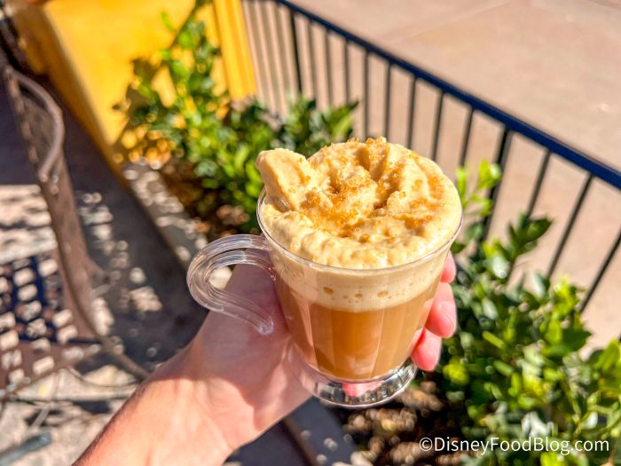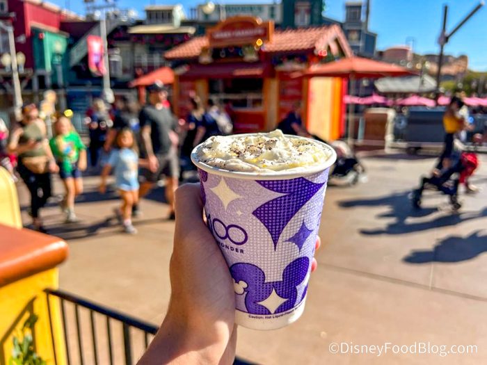 There are two drinks on the menu here, the first being the new Santa’s Milk & Cookies Hot Cocoa, which is inspired by the Disney+ series The Santa Clauses. It contains whole milk, cookies and cream powder, and white chocolate with whipped cream for $7. This is a GREAT hot cocoa with a cookies and cream taste. It’s also very smooth (and not powdery, which sometimes happens with hot cocoa). We’d drink this again.