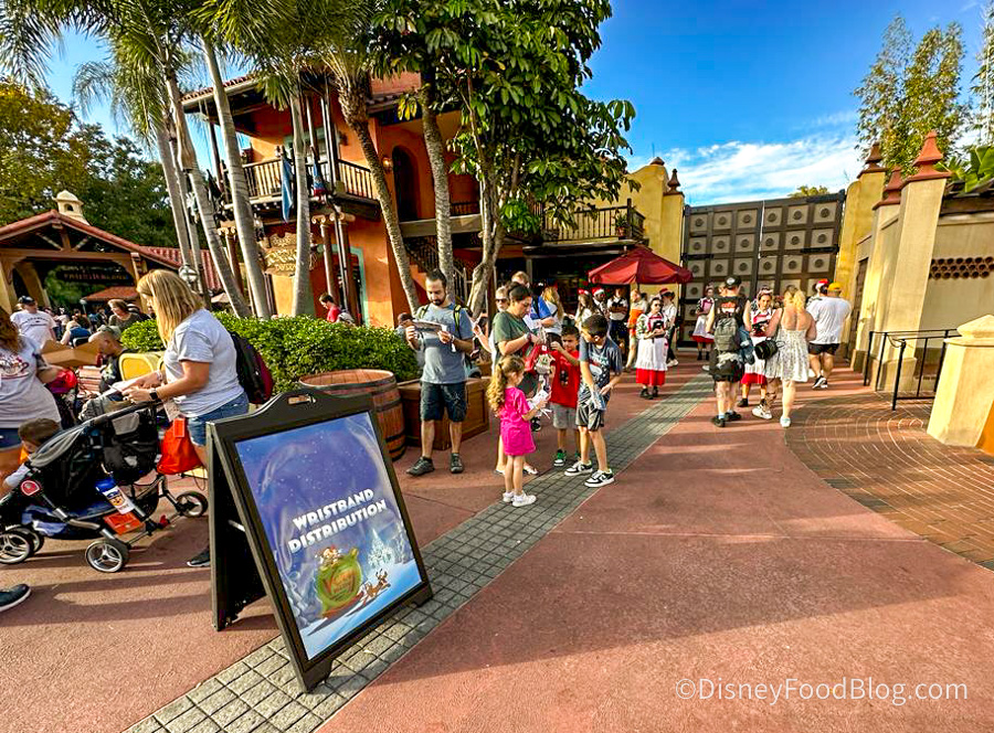 If you’ve already used a park ticket earlier to experience Magic Kingdom for the day (meaning you’ve scanned a separate park ticket for entrance earlier in the day), you can pick up your wristband at different spots around the park — like this one in Adventureland.