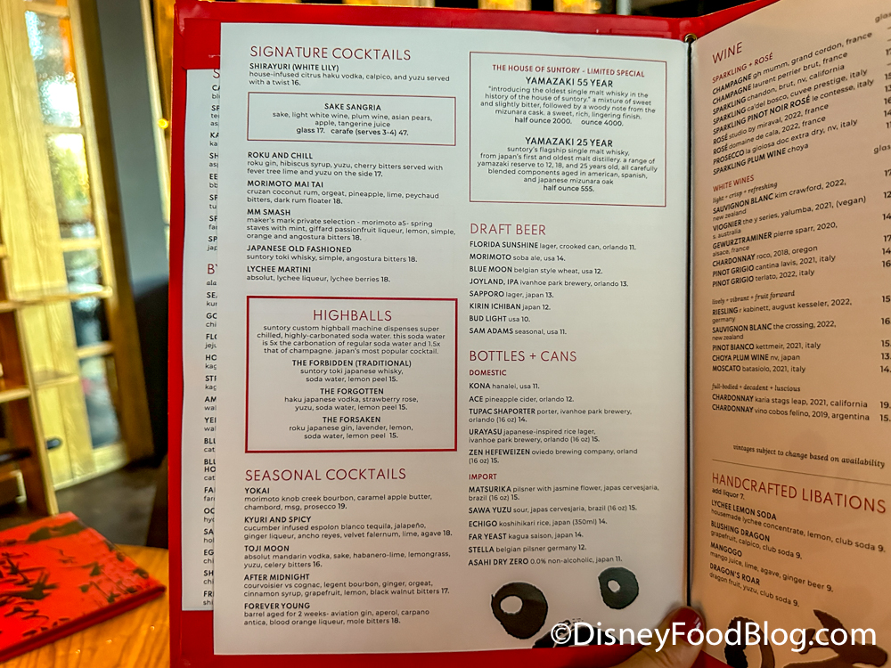 The restaurant has an extensive drink menu, with various signature cocktails, seasonal cocktails, limited edition Japanese whisky, and beer.