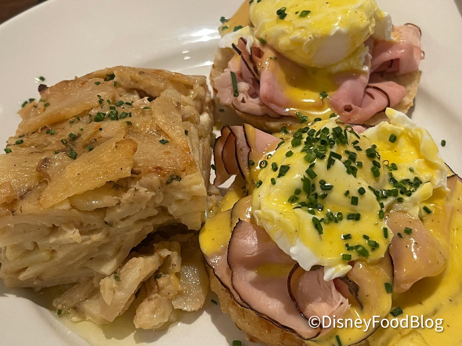 Next up, we had the Traditional Biscuit Benedict. This is a white cheddar biscuit that’s been piled with Black Forest ham, poached eggs, and classic hollandaise, and comes with sour cream and onion scalloped potatoes. It was delicious! The hollandaise sauce is creamy and mild, and the egg was cooked perfectly.