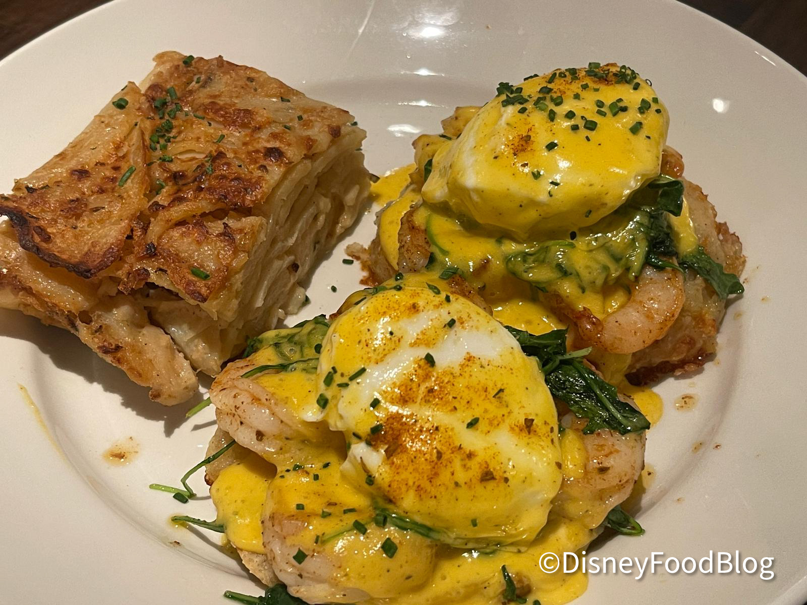 Since we wanted to try some breakfast items, too, we decided to have those as a sort of appetizer. We started off with the Pancake Pops for $21, the Traditional Biscuit Benedict for $25, and the Cajun Shrimp Biscuit Benedict for $27.