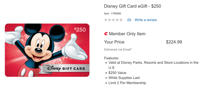 So, there is a catch to getting these discounted gift cards. You’ll need to be a Costco member (or, hey, if you know a Costco member who will help you out, that works, too). That’s because Costco is now running a special deal where you can buy a $250 Disney gift card for $225 — that’s a savings of 10%.