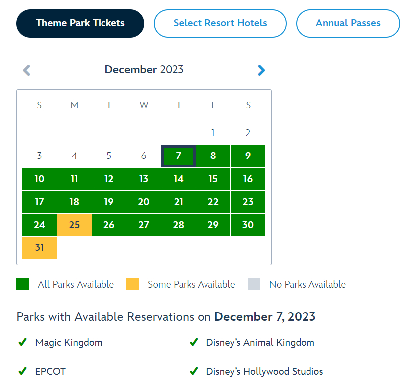 So here’s the deal. When we check park pass availability for the month of December, you’ll still see that most of the next two weeks are still open for visitors with theme park tickets and resort guests, save for the 25th and 31st.